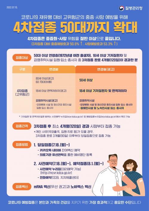 ½Ã¿¡ µû¸£¸é 4Â÷ Á¢Á¾ ´ë»óÀ» ±âÁ¸ 60¼¼ À̻󿡼 50´ë(1972³â ÀÌÀü Ãâ»ýÀÚ) ¹× 18¼¼ ÀÌ»ó ±âÀúÁúȯÀÚ·Î, °¨¿° Ãë¾à ½Ã¼³(Á¾»çÀÚ, ÀÔ¼ÒÀÚ)ÀÇ °æ¿ì ¿ä¾çº´¿ø¡¤½Ã¼³»Ó ¾Æ´Ï¶ó Àå¾ÖÀνü³°ú ³ë¼÷Àڽü³±îÁö È®´ëÇØ ÁøÇàÇÑ´Ù.
