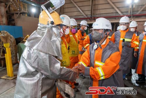 Á¤ ½ÃÀåÀº ÇöÀå Á÷¿øµé¿¡°Ô Á÷Á¢ °Ý·ÁÀÇ Àλ縦 ÀüÇϱâ À§ÇØ ¾ÈÀüº¹°ú ¾ÈÀüº¸È£±¸¸¦ Âø¿ëÇÏ°í °øÀå °÷°÷À» ´Ù´Ï¸ç ¼¼°è ÃÖ°íÀÇ Ã¶° Á¦Ç°À» »ý»êÇϱâ À§ÇØ ¹¬¹¬È÷ Èû¾²´Â Á÷¿øµéÀÇ ³ë°í¿¡ °¨»ç¸¦ Ç¥Çß´Ù.