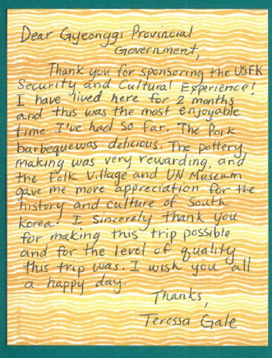 ½ÇÁ¦·Î üÇè¿¡ Âü¿©Çß´ø Å×·¹»ç °ÔÀÏ ¾¾´Â ¼Çѹ®À» ÅëÇØ ¡°Çѱ¹¿¡¼ Áö³½ ½Ã°£ Áß °¡Àå Áñ°Å¿î ½Ã°£À̾ú´Ù. ƯÈ÷ À¯¿£±º ÃÊÀü±â³ä°ü, ¹Î¼ÓÃÌ¿¡¼ Çѱ¹ÀÇ ¿ª»ç¿Í ¹®È¸¦ ¹è¿öº¸´Â °ÍÀº ¸Å¿ì °¡Ä¡ ÀÖ¾ú´Ù. ¹®ÈÀû °æÇèÀ» Áö¿øÇØ ÁØ °æ±âµµ¿¡ ¸Å¿ì °¨»çµå¸°´Ù¡±°í ¼Ò°¨À» ÀüÇϱ⵵ Çß´Ù.