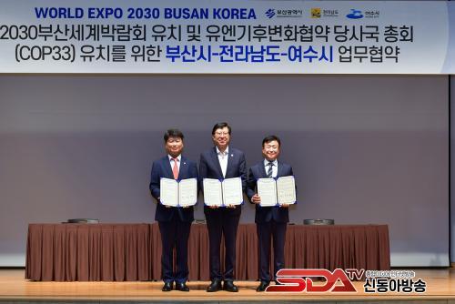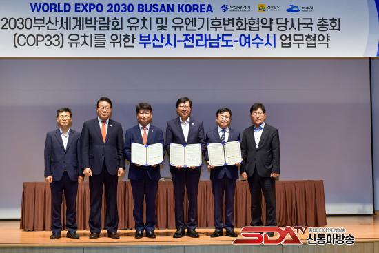 ÇÑÆí, À̳¯ Çù¾à½ÄÀÌ ³¡³ ÈÄ ºÎ»ê±¤¿ª½Ã ÁÖ°üÀ¸·Î 2030¼¼°è¹Ú¶÷ȸ ºÎ»ê À¯Ä¡¸¦ ±â¿øÇÏ´Â Åä·Ðȸ¿Í Àü³² ½Ã¹ÎÁö¿ø´Ü ¹ßÁ·½ÄÀÌ ¿©¼ö¼¼°è¹Ú¶÷ȸÀå¿¡¼ ¿·È´Ù.
