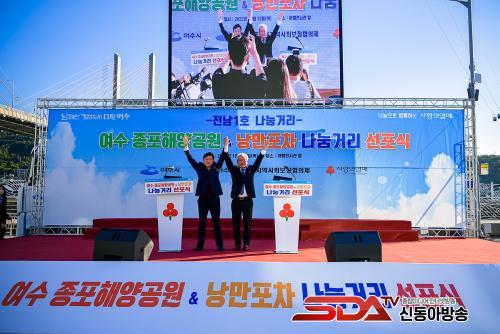 ÇÑÆí, 13ÀÏ ¿ÀÈÄ ³¶¸¸Æ÷Â÷ ÇϸáÀü½Ã°ü ¾Õ¿¡¼ ¿¸° ¼±Æ÷½Ä¿¡´Â Á¤±â¸í ¿©¼ö½ÃÀå°ú ³ëµ¿ÀÏ Àü³² »ç¶ûÀÇ ¿¸Å ȸÀå, ±è¿µ±Ô ½ÃÀÇÀå, µ¿¹®µ¿ ¼ÕÁØÀÚ ÁÖ¹ÎÀÚÄ¡À§¿øÀå, À±ÁøµÎ Áö¿ª»çȸº¸ÀåÇùÀÇü À§¿øÀåÀ» ºñ·ÔÇØ ÁÖÀΰøÀÎ ÂøÇѰ¡°Ô ÀÚ¿µ¾÷ÀÚ¿Í °ü°èÀÚ µî 100¿© ¸íÀÌ Âü¼®Çß´Ù.