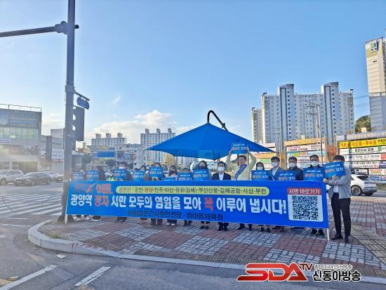 °øµ¿ÃßÁøÇùÀÇȸÀåÀÎ Á¤ÀÎÈ ±¤¾ç½ÃÀå°ú ¼¿µ¹è ±¤¾ç½ÃÀÇȸ ÀÇÀå, ±èÁøÈ¯ ¹Î°£ÃßÁøÀ§¿øÀå, µµ¡¤½ÃÀÇ¿ø, ½Ã¹Î»çȸ´Üü µî 300¿© ¸íÀÌ Âü¼®ÇÑ °¡¿îµ¥ KTX-ÀÌÀ½ ±¤¾ç¿ª Á¤Â÷ ½ÇÇöÀ» À§ÇÑ ÇѸ¶À½ ÇѶæÀ» ¸ð¾Æ È«º¸ÇßÀ¸¸ç Á¤ÀÎÈ ±¤¾ç½ÃÀåÀº À̸¥ ¾ÆÄ§ Âü¿©Àڵ鿡°Ô °¨»ç¿Í °Ý·Á¸¦ ¾Æ³¢Áö ¾Ê¾Ò´Ù.