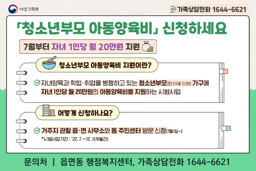 ½Ã °ü°èÀÚ´Â ¡°Ã»¼Ò³â ºÎ¸ð ¾Æµ¿ ¾çÀ°ºñ Áö¿ø ½Ã¹ü»ç¾÷ÀÌ ³»³â¿¡µµ °è¼ÓÇØ¼ ½ÃÇà ¿¹Á¤À̹ǷÎ, ÇöÀç Áö¿øÀ» ¹ÞÁö ¾Ê´Â û¼Ò³â ºÎ¸ð °¡±¸ ¹× »ç½ÇÈ¥ »óÀÇ Ã»¼Ò³â ºÎºÎµµ ½ÅÃ»ÇØ ÀÚ³à ¾çÀ°¿¡ µµ¿òÀ» ¹ÞÀ¸½Ã±æ ¹Ù¶õ´Ù¡±°í ¸»Çß´Ù.