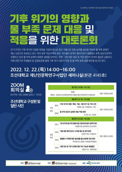 Á¶¼±´ëÇб³ Àç³Àι®Çבּ¸»ç¾÷´ÜÀº ¿À´Â 22ÀÏ ¿ÀÈÄ 2~4½Ã Àç³Àι®Çבּ¸»ç¾÷´Ü ¼¼¹Ì³ª½Ç¿¡¼ ¿Â¡¤¿ÀÇÁ¶óÀÎÀ¸·Î ¡®±âÈÄ À§±âÀÇ ¿µÇâ°ú ¹° ¹«Á· ¹®Á¦ ´ëÀÀ ¹× ÀûÀÀÀ» À§ÇÑ´ëÅä·Ðȸ¡¯¸¦ ¿¬´Ù°í ¹àÇû´Ù.