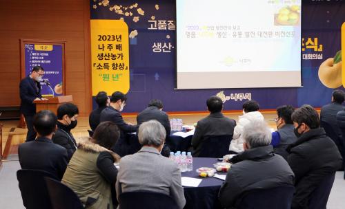 Àü¶ó³²µµ ³ªÁÖ½Ã(½ÃÀå À±º´ÅÂ)´Â Áö³ 23ÀÏ ½Ãû»ç ´ëȸÀǽǿ¡¼ ¡®¸íǰ ³ªÁÖ¹è »ý»ê¡¤À¯Åë ¹ßÀü ´ëÀüȯ ºñÀü ¼±Æ÷½Ä¡¯À» °³ÃÖÇß´Ù°í 26ÀÏ ¹àÇû´Ù.