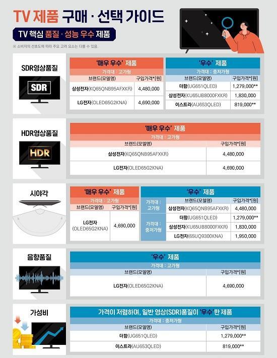 ÀÌ¿¡ Çѱ¹¼ÒºñÀÚ¿ø(¿øÀå Àå´öÁø)ÀÌ ÁÖ¿ä ºê·£µå TV 6°³ Á¦Ç°(°í°¡Çü/ÁßÀú°¡Çü)À» ½ÃÇèÆò°¡ÇÑ °á°ú, ÀϹÝÈÁú(SDR) ¿µ»ó, ½Ã¾ß°¢, µ¿¿µ»ó ²ø¸² µîÀÇ ¼º´ÉÀº Àü Á¦Ç°ÀÌ ¾çÈ£ÇÑ ¼öÁØÀ̾úÀ¸³ª, °íÈÁú(HDR) ¿µ»ó°ú À½ÇâǰÁúÀº Á¦Ç° °£ Â÷À̰¡ Å« °ÍÀ¸·Î È®ÀεƴÙ.