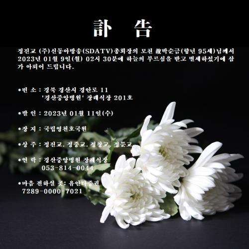 Á¤Áø±³ (ÁÖ)½Åµ¿¾Æ¹æ¼Û(SDATV)ÃÑȸÀåÀÇ ¸ðÄ£ ¹Ú¼ø±Ý(Çâ³â 95¼¼)´Ô²²¼ 2023³â 01¿ù 9ÀÏ(¿ù) 02½Ã 30ºÐ¿¡ ÇÏ´ÃÀÇ ºÎ¸£½ÉÀ» ¹Þ°í º°¼¼Çϼ̱⿡ »ï°¡ ¾Æ·Ú¾î µå¸³´Ï´Ù.