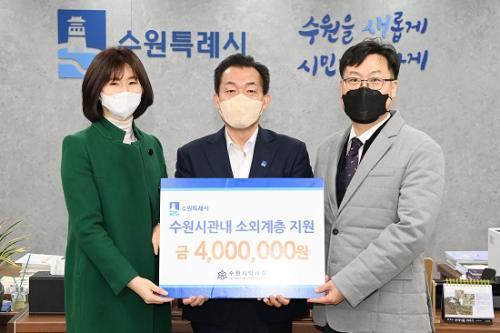 ¼ö¿ø½Ã ¾à»çȸ ±èÈ£Áø ȸÀå°ú ½ÅÁö¿¬ ºÎȸÀåÀº 25ÀÏ ¼ö¿ø½ÃûÀ» ¹æ¹®ÇØ ÀÌÀçÁØ ¼ö¿øÆ¯·Ê½ÃÀå¿¡°Ô ¼º±ÝÀ» Àü´ÞÇß´Ù.
