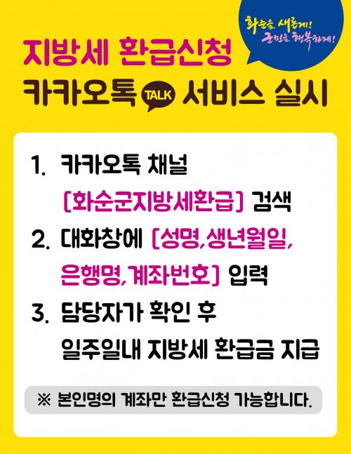 ÀÌ¿ë ¹æ¹ýÀº īī¿ÀÅå °Ë»öâ¿¡¼ ¡°È¼ø±º Áö¹æ¼¼ ȯ±Þ¡±À» °Ë»öÇØ ä³ÎÀ» Ãß°¡ 1´ë1 äÆÃ¹æ¿¡ ¼º¸í, »ý³â¿ùÀÏ, ÀºÇà¸í, °èÁ¹øÈ£ µîÀ» Àü¼ÛÇØ ȯ±Þ±ÝÀ» ½ÅûÇÏ¸é ´ã´çÀÚ Á¢¼ö ÈÄ È®ÀΰúÁ¤À» °ÅÃÄ ±Ù¹«ÀÏ ±âÁØ 1ÁÖÀÏ À̳» ÀºÇà°èÁ·ΠÁö±ÞµÈ´Ù.