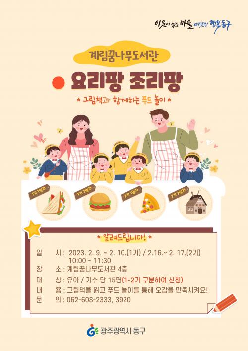 ¸ÕÀú ¡®¿ä¸®ÆÎ Á¶¸®ÆÎ¡¯Àº 1¡¤2±â·Î ³ª´² ±â¼ö´ç °¢ 15¸í¾¿ ¸ðÁýÇÒ °èȹÀÌ´Ù. 1±â(2¿ù 9~10ÀÏ), 2±â(2¿ù 16~17ÀÏ)·Î ¼±¹ßµÇ¸é ±×¸²Ã¥À» ÀÐÀº ÈÄ »÷µåÀ§Ä¡, Çܹö°Å, ¶Ç¶ì¾Æ ÇÇÀÚ, °úÀÚÁý µî °ü·Ã À½½ÄÀ» ¸¸µå´Â üÇèÀ» ÇÒ ¼ö ÀÖ´Ù.