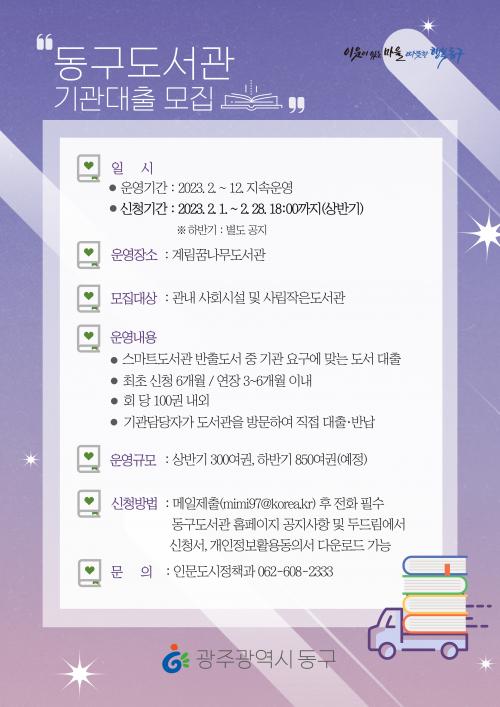 ½Åû ±â°£Àº 2¿ù 1ÀϺÎÅÍ 28ÀÏ ¿ÀÈÄ 6½Ã±îÁö´Ù. µ¿±¸µµ¼°ü ´©¸®Áý °øÁö»çÇ×(lib.donggu.kr/Notice)¿¡¼ ½Åû¼¸¦ ³»·Á¹Þ¾Æ À̸ÞÀÏ(mimi97@korea.kr)·Î Á¦ÃâÇÏ¸é µÇ¸ç, ±âŸ ÀÚ¼¼ÇÑ »çÇ×Àº Àι®µµ½ÃÁ¤Ã¥°ú µµ¼°ü°è·Î ¹®ÀÇÇÏ¸é µÈ´Ù.