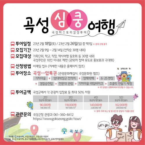 À̹ø ÆÔÅõ¾î ½Åû°ú ÀÚ¼¼ÇÑ »çÇ×Àº ±º ´©¸®Áý(https://www.gokseong.go.kr/), ±º ¹®È°ü±¤´©¸®Áý(https://www.gokseong.go.kr/tour/), ÀνºÅ¸±×·¥(°î¼º±º gokseong_love / ¼¶Áø°±âÂ÷¸¶À» gstrainvillage_official)¿¡¼ È®ÀÎÇÒ ¼ö ÀÖ´Ù. ¾È³»¹®À» Âü°íÇØ ½Åû¼¿Í °³ÀÎÁ¤º¸µ¿ÀǼ¸¦ Á¦Ãâ ÈÄ ±º ´ã´çÀÚÀÇ À¯¼± ¾È³»¸¦ ¹ÞÀ¸¸é ÀÌ¿ë °¡´ÉÇÏ´Ù.