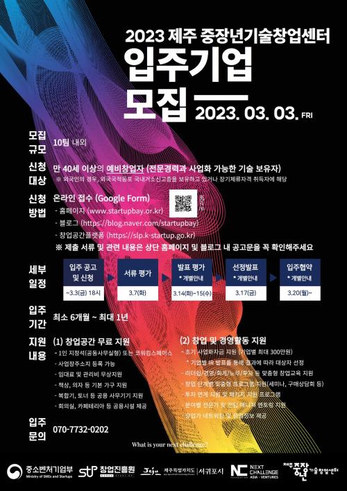 2023³â ¸ðÁý ´ë»óÀº 10°³ÆÀ ³»¿ÜÀ̸ç, Á¢¼ö´Â ½ºÅ¸Æ®¾÷º£ÀÌ È¨ÆäÀÌÁö(https://startupbay.or.kr) ȤÀº K-Startup â¾÷°ø°£Ç÷§Æû, Æ÷½ºÅÍ ³»¿¡ QRÄڵ带 ÅëÇØ È®ÀÎ °¡´ÉÇÏ¸ç ¼±ÍÆ÷½Ã °æÁ¦ÀÏÀÚ¸®°ú ¶Ç´Â Á¦ÁÖ ÁßÀå³â±â¼úâ¾÷¼¾ÅÍ·Î ÀüÈ ¹®Àǵµ °¡´ÉÇÏ´Ù.