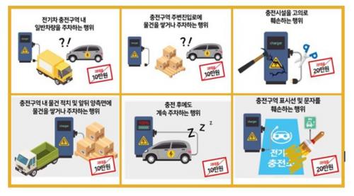 ÃæÀü¹æÇØ ÇàÀ§¿¡ µû¶ó 10~20¸¸ ¿øÀÇ °úÅ·ᰡ ºÎ°úµÇ¸ç, °úÅÂ·á ´ë»óÀº ¡â Àü±âÂ÷ ÃæÀü±¸¿ª¿¡ ÀϹÝÂ÷·®ÀÌ ÁÖÂ÷Çϰųª ¡â Àü±âÂ÷³ª Çöó±×ÀÎ ÇÏÀ̺긮µå ÀÚµ¿Â÷°¡ ÃæÀü½Ã°£(¿Ï¼Ó : 14½Ã°£ÀÌ»ó, ±Þ¼Ó 1½Ã°£ÀÌ»ó)À» ÃʰúÇÏ¿© °è¼Ó ÁÖÂ÷ÇÑ °æ¿ì, ¡â Àü±âÂ÷ ÃæÀü±¸¿ª ÁøÀԷο¡ ¹°°Ç µîÀ» ÀûÄ¡ÇØ Àü±âÂ÷ ÃæÀüÀ» ¹æÇØÇÏ´Â ÇàÀ§´Â 10¸¸¿øÀÇ °úÅ·ᰡ ºÎ°úµÇ¸ç, ¡â ÃæÀü½Ã¼³À» °íÀÇ·Î ±¸¿ª ÈÑ¼Õ ½Ã¿¡´Â 20¸¸¿øÀÇ °úÅ·ᰡ ºÎ°úµÇ°í ÀÖ´Ù.