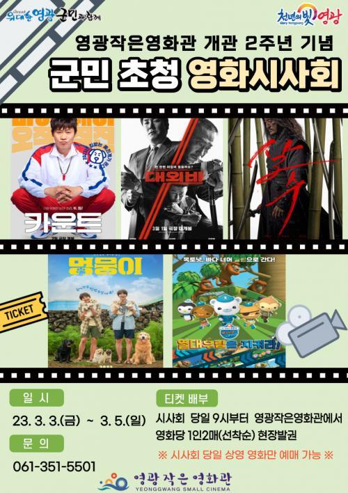 3¿ù 3ÀÏ(±Ý)ºÎÅÍ 3¿ù 5ÀÏ(ÀÏ)±îÁö 3Àϰ£Àº ¿µ±¤±º¹Î(°³ÀÎ)À» À§ÇÑ ½Ã»çȸ·Î ¿µÈ»ó¿µ ´çÀÏ ¿ÀÀü 9½ÃºÎÅÍ ¿µ±¤ÀÛÀº¿µÈ°ü¿¡¼ ¼±Âø¼ø ÇöÀå ¿¹¸Å(¿µÈ´ç 1ÀÎ 2¸Å ÇÑÁ¤)°¡ °¡´ÉÇÏ¸ç »ó¿µ ¿¹Á¤ ÀÛǰÀ¸·Î´Â ¡®¹Ù´ÙŽÇè´ë ¿ÁÅä³Ó¡¯, ¡®Ä«¿îÆ®¡¯, ¡®»ì¼ö¡¯, ¡®´ë¿Üºñ¡¯, ¡®¸Û¹¶ÀÌ¡¯°¡ ÀÖ´Ù.