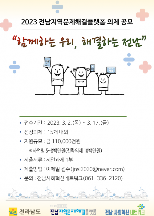 Áö¿ª ¹®Á¦ ÇØ°á¿¡ °ü½É ÀÖ´Â µµ¹ÎÀ̳ª ´Üü‧±â°üÀº Àü³²µµ ´ëÇ¥ ´©¸®Áý °í½Ã․°ø°í³ª Àü³²»çȸÇõ½ÅÇ÷§Æû ´©¸®Áý °øÁö»çÇ׿¡¼ ½Åû ¹æ¹ý µîÀ» È®ÀÎÇÑ ÈÄ ÀüÀÚ¿ìÆí(jnsi2020@naver.com)À¸·Î Á¦¾È°úÁ¦ ½Åû¼¸¦ Á¦ÃâÇÏ¸é µÈ´Ù.