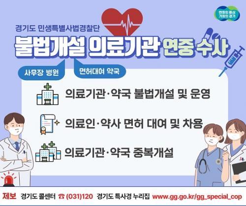 ÀÌ¿¡ °æ±âµµ ¹Î»ýƯº°»ç¹ý°æÂû´ÜÀº ¡ãÀÇ·áÀΡ¤¾à»ç°¡ ¾Æ´Ñ ÀÚÀÇ ÀÇ·á±â°ü¡¤¾à±¹ ºÒ¹ý °³¼³ ¹× ¿î¿µ ¡ãÀÇ·áÀΡ¤¾à»ç ¸éÇã ´ë¿© ¹× Â÷¿ë ¡ãÀÇ·á±â°ü¡¤¾à±¹ Áߺ¹°³¼³ µî ºÒ¹ýÇàÀ§¸¦ ¿¬Áß¼ö»çÇϰí ÇàÀ§ÀÚ¸¦ ÀÔ°ÇÇØ °ËÂû¿¡ ¼ÛÄ¡ÇÏ´Â µî ¾öÁ¤ Á¶Ä¡ÇÒ ¹æÄ§ÀÌ´Ù.