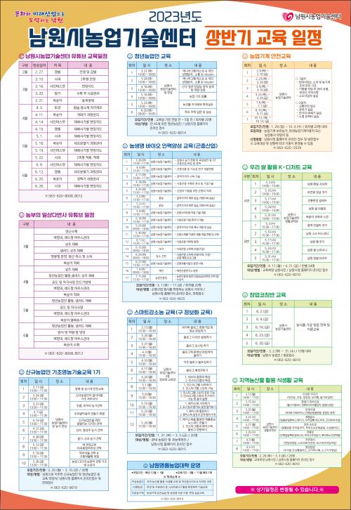 [½Åµ¿¾Æ¹æ¼Û=±èº´Áø±âÀÚ]³²¿ø½Ã³ó¾÷±â¼ú¼¾ÅÍ(¼ÒÀå °íÀιè)¿¡¼­ 2023³âµµ »ó¹Ý±â ±³À°ÀÏÁ¤ Æ÷½ºÅÍ¿Í ¸®Çø´À» Á¦ÀÛÇß´Ù. ³²¿ø½Ã³ó¾÷±â¼ú¼¾ÅÍ À¯Æ©ºêºÎÅÍ Ã»³â³ó¾÷ÀÎ, ³ó¾÷±â°è ¾ÈÀü±³À°±îÁö ÃÑ 11°³ °úÁ¤¿¡ ´ëÇÑ ¸ðÁý±â°£, ¹æ¹ý µî¿¡ ´ëÇÑ ±³À°Á¤º¸°¡ ´ã°ÜÀÖ´Ù.