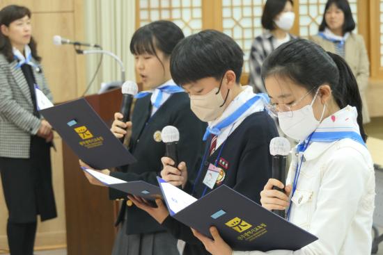 ¹ß´ë½Ä¿¡ Âü¿©ÇÑ ÇлýµéÀº ÀÓ¸íÀåÀ» Àü´Þ¹ÞÀº µÚ È«º¸´ÜÀ¸·Î¼ ´ëÇѹα¹ ¹ÎÁÖÁÖÀÇÀÇ ¼ÒÁßÇÑ ÀÚ»êÀÎ 5¡¤18¹ÎÁÖȿ Á¤½Å È«º¸¿¡ Èû¾µ °ÍÀ» ¾à¼ÓÇß´Ù. ¹ÎÁÖ, ÀαÇ, ÆòÈ, ³ª´®, °øµ¿Ã¼ Á¤½ÅÀ» ½ÇõÇÏ´Â ¸í¿¹·Î¿î û¼Ò³â 5¡¤18 È«º¸´Ü ¡®Çª¸¥»õ¡¯ ´Ü¿øÀ¸·Î¼ Ȱµ¿ÇÒ °ÍÀ» ´ÙÁüÇÏ´Â ¼±¼¸¦ ´Ù ÇÔ²² ³¶µ¶ÇÏ¸ç ¸¶À½°¡ÁüÀ» ´ÙÁüÇÏ´Â °áÀǰ¡ À̾îÁ³´Ù.