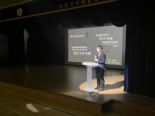¸ÕÀú ³²¿ø±¹¾Ç¿¹¼ú°íµîÇб³´Â »ç¿ëÀÚÂü¿© ¼³°è¸¦ ÅëÇØ ±³¹«½Ç Àç¹èÄ¡·Î °ø°£À» È®º¸ÇÏ°í ±¹¾Ç ¿¬½À°ú ¸ðµÒ¼ö¾÷ÀÌ ÇÑ °ø°£¿¡¼­ ½Ç½ÃÇÒ ¼ö ÀÖµµ·Ï °ø°£À» ±¸ÃàÇß´Ù.