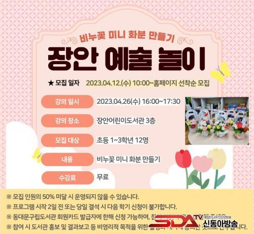 ÃʵîÇб³ 1~3ÇгâÀ» ´ë»óÀ¸·Î ¿î¿µµÇ´Â À̹ø ¡®Àå¾È ¿¹¼ú ³îÀÌ¡¯ÀÇ ³»¿ëÀº ¡®ºñ´©²É ¹Ì´Ï ȺР¸¸µé±â¡¯·Î ¾ÆÀ̵éÀÌ ºñ´©²ÉÀ» Ȱ¿ëÇØ ²É²ÈÀ̸¦ ÁøÇàÇϰí, ¹Ì´Ï ȺÐÀ» ¸¸µé¾î º¸´Â ¼ö¾÷ÀÌ´Ù. ¼ö°½ÅûÀº Àå¾È¾î¸°À̵µ¼°ü ´©¸®Áý(¹®È¸¶´ç▻ÇÁ·Î±×·¥ Çà»çÁ¢¼ö)¿¡¼ 4¿ù 12ÀÏ(¼ö) ¿ÀÀü 10½ÃºÎÅÍ °¡´ÉÇÏ´Ù.