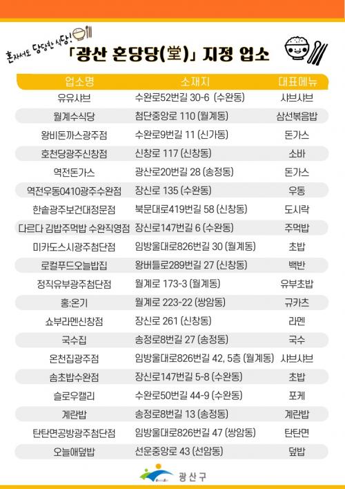 [½Åµ¿¾Æ¹æ¼Û=³²À¯¼®±âÀÚ]±¤ÁÖ ±¤»ê±¸(±¸Ã»Àå ¹Úº´±Ô)´Â Æí¾ÈÇÑ 1ÀÎ ½Ä»ç°¡ °¡´ÉÇÑ ¡®±¤»ê È¥´ç´ç(È¥ÀÚ¼­µµ ´ç´çÇÑ ½Ä´ç) 20°÷À» ÁöÁ¤Çß´Ù°í ¹àÇû´Ù.