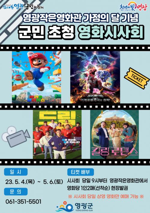 5¿ù 4ÀÏ(¸ñ)ºÎÅÍ 5¿ù 6ÀÏ(Åä)±îÁö 3Àϰ£Àº ¿µ±¤±º¹Î(°³ÀÎ)À» À§ÇÑ ½Ã»çȸ·Î ¿µÈ»ó¿µ ´çÀÏ ¿ÀÀü 9½ÃºÎÅÍ ¿µ±¤ÀÛÀº¿µÈ°ü¿¡¼ ¼±Âø¼ø ÇöÀå ¿¹¸Å(¿µÈ´ç 1ÀÎ 2¸Å ÇÑÁ¤)°¡ °¡´ÉÇÏ¸ç »ó¿µ ¿¹Á¤ ÀÛǰÀ¸·Î´Â ¡®½´ÆÛ ¸¶¸®¿À ºê¶ó´õ½º¡¯, ¡®¾Æ¸Óµå »ç¿ì¸£½º¡¯, ¡®µå¸²¡¯, ¡®Å³¸µ ·Î¸Ç½º¡¯°¡ ÀÖ´Ù.