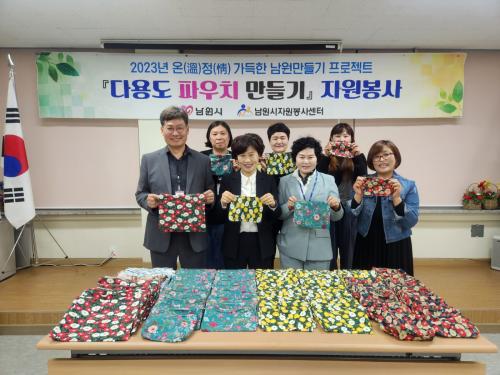 ³²¿ø½ÃÀÚ¿øºÀ»ç¼¾ÅÍ´Â ¡®¿Âè®Á¤ï×°¡µæÇÑ ³²¿ø¸¸µé±â¡¯ ÇÁ·ÎÁ§Æ®ÀÇ ÀÏȯÀ¸·Î Áö³ 1¿ù¿¡ 60¿©¸íÀÇ ÀÚ¿øºÀ»çÀÚ¸¦ ¸ðÁýÇÏ¿© ¾à 3°³¿ù°£¿¡ °ÉÃÄ ÆÄ¿ìÄ¡¸¦ Á¦ÀÛÇÏ¿´´Ù. ¡®¿Âè®Á¤ï×°¡µæÇÑ ³²¿ø¸¸µé±â¡¯ ÇÁ·ÎÁ§Æ®´Â ¼Ò¿Ü°èÃþÀÇ ÀÏ»ó»ýȰ¿¡ ÇÊ¿äÇÑ ¹°Ç°À» Á¦ÀÛÇÏ¿© Àü´ÞÇÔÀ¸·Î½á »çȸÀû ³ª´®À» ½ÇõÇÏ´Â ºÀ»çȰµ¿À¸·Î 2022³âºÎÅÍ ½ÃÀ۵ǾúÀ¸¸ç, À۳⿡µµ À§»ý¿ëǰ ÆÄ¿ìÄ¡ 150°³¸¦ Á¦ÀÛÇÏ¿© À§»ý¿ëǰ°ú ÇÔ²² û¼Ò³â»ó´ãº¹Áö¼¾ÅÍ, û¼Ò³â¹®ÈÀÇÁý, û¼Ò³â¼ö·Ã°ü¿¡ Àü´ÞÇß´Ù.