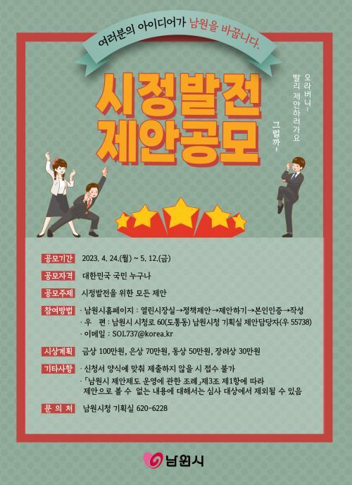 °ø¸ð°úÁ¦·Î´Â ³²¿øÀÇ ¹ßÀüÀ» À§ÇÑ ¸ðµç Á¦¾ÈÀ̸ç Âü¿©¹æ¹ýÀº ³²¿ø½Ã ȨÆäÀÌÁö °ø°í¸¦ Âü°íÇÏ¿© ½Åû¼¸¦ ÀÛ¼ºÇÏ¿© ¹æ¹®, ¿ìÆí, À̸ÞÀÏ µîÀ¸·Î Á¦ÃâÇÏ¸é µÈ´Ù.