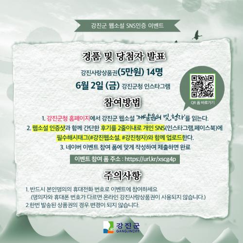 5¿ù À̺¥Æ®´Â 5¿ù 8ÀÏÀ» ½ÃÀÛÀ¸·Î 5¿ù 28ÀϱîÁö 21Àϰ£ ÁøÇàµÇ¸ç, À¥¼Ò¼³À» ±¸µ¶Çϰí ÀÎÁõ¼¦°ú ÇÔ²² °£´ÜÇÑ ÈÄ±â ¹× Çʼö ÇØ½Ãű×(#°ÁøÀ¥¼Ò¼³, #°ÁøÃ»ÀÚ)¸¦ ¾÷·Îµå Çϸé Ãß÷À» ÅëÇØ °Áø»ç¶û»óǰ±Ç(5¸¸ ¿ø)À» 14¸í¿¡°Ô Á¦°øÇÑ´Ù.