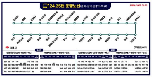 À̹ø¿¡ ¿¬Àå¿îÇàÇÏ´Â ½Ã³»¹ö½º ³ë¼±Àº ÀüÅë½ÃÀå~Å͹̳Î~¹é»ê¸é Áö¿À½ºÅ×À̼ÇÀ» °æÀ¯ÇÏ´Â 100¹ø ¼øÈ¯³ë¼±°ú, ±èÁ¦¿ª~°ø´ö¸é~À¯°°Ë¹®¼Ò~¹é±¸Æ¯Àå´ÜÁö~¹é±¸¸éÇàÁ¤º¹Áö¼¾Å͸¦ ¿îÇàÇÏ´Â 24¹ø, 25¹ø ½Ã³»¹ö½º·Î, ÇØ´ç ½Ã³»¹ö½ºÀÇ ³ë¼±µµ¿Í ¿îÇà½Ã°£Àº ±èÁ¦½Ãû ȨÆäÀÌÁö¿¡¼ È®ÀÎÀÌ °¡´ÉÇÏ´Ù.