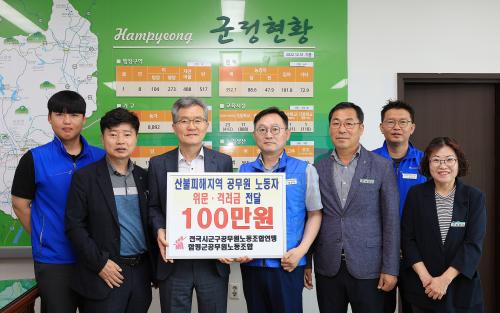 26ÀÏ ±º¿¡ µû¸£¸é °ø¹«¿ø³ëµ¿Á¶ÇÕ¿¬¸ÍÀÌ À̳¯ ¿ÀÀü Áö³´Þ ¹ß»ýÇÑ »êºÒ ÁøÈ ÀÛ¾÷¿¡ Âü¿©ÇÑ ÇÔÆò±º °ø¹«¿øÀ» °Ý·ÁÇϱâ À§ÇØ 100¸¸¿øÀ» Àü´ÞÇß´Ù.