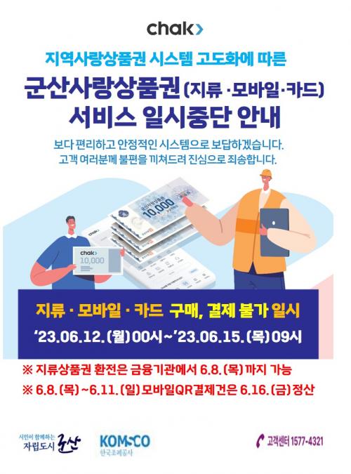 ±º»ê½Ã´Â ¡®Áö¿ª»ç¶û »óǰ±Ç chak¡¯ ½Ã½ºÅÛ °³ÆíÀ¸·Î ¿À´Â 6¿ù 12ÀÏ ÀÚÁ¤ºÎÅÍ 15ÀÏ ¿ÀÀü 9½Ã±îÁö ±º»ê»ç¶û»óǰ±Ç¿¡ ´ëÇÑ ¸ðµç ¼ºñ½º°¡ ÀϽà Áß´ÜµÈ´Ù°í ¹àÇû´Ù.