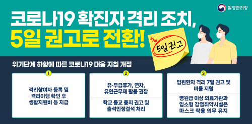 ¶Ç Äڷγª19 È®ÁøÀÚÀÇ 7ÀÏ °Ý¸® Àǹ«°¡ 5ÀÏ ±Ç°í·Î ÀüȯµÊ¿¡ µû¶ó Äڷγª19 È®ÁøÀÚ³ª È®ÁøÀÚ¿Í Á¢ÃË ÈÄ ÀÇ½É Áõ»óÀÌ ÀÖ´Â »ç¶÷Àº ¸¶½ºÅ© Âø¿ë Àǹ«°¡ ¾ø´õ¶óµµ Âø¿ëÇÒ °ÍÀ» Àû±Ø ±Ç°íÇÒ ¹æÄ§ÀÌ´Ù.