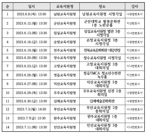 2018³â ½ÃÀÛÇØ ¿ÃÇØ·Î 6³â°¸¦ ¸Â´Â ¡®Ã£¾Æ°¡´Â ±³À°È°µ¿ º¸È£ ¿¬¼ö¡¯´Â 8ÀÏ ³²¿ø±³À°Áö¿øÃ»À» ½ÃÀÛÀ¸·Î 7¿ù 11ÀÏ Áø¾È±³À°Áö¿øÃ»±îÁö µµ³» 14°³ ½Ã¡¤±º ±³À°Áö¿øÃ»º°·Î ÀÌ·ç¾îÁø´Ù.