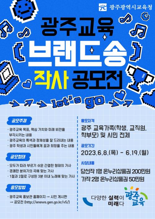 ºê·£µå ¼ÛÀÇ °æ¿ì ±¤ÁÖ ±³À°°¡Á·(Çлý¡¤±³Á÷¿ø¡¤Çкθð) ¹× ½Ã¹Î ´ë»óÀ¸·Î °¡»ç °ø¸ð¸¦ ÁøÇàÇÑ´Ù. ÁÖÁ¦´Â ±¤ÁÖ±³À°ÀÇ Á¤Ã¼¼º°ú ¹Ì·¡ ºñÀü, ±¤ÁÖ Çлýµé¿¡°Ô ²Þ°ú Èñ¸ÁÀ» ÁÖ´Â ³»¿ëÀ¸·Î ¼³Á¤Çß´Ù.