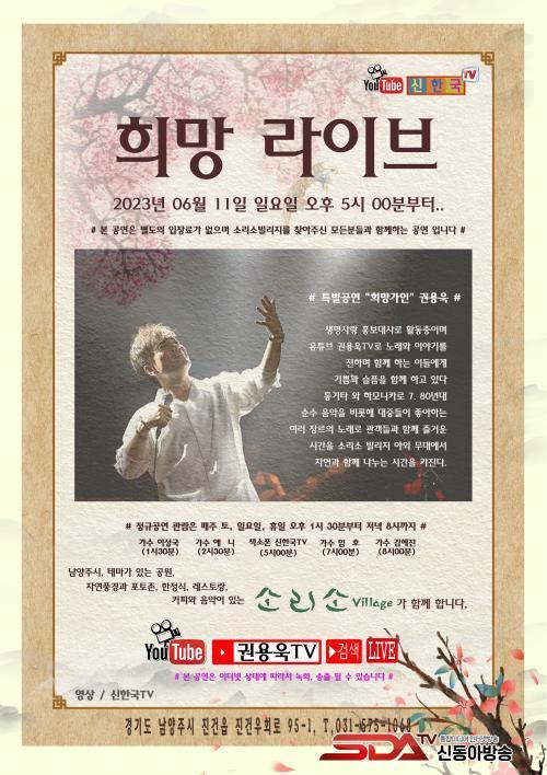 [½Åµ¿¾Æ¹æ¼Û=½Å°æ½Ä±âÀÚ] 2023³â 6¿ù 11ÀÏ ÀÏ¿äÀÏ ¿ÀÈÄ 5½ÃºÎÅÍ °¡¼ö ±Ç¿ë¿íÀÌ Å׸¶ °ø¿ø ¼Ò¸®¼Òºô¸®Áö¿¡¼­ Ưº°ÇÑ ¸¸³²À» °¡Áø 'Èñ¸Á ¶óÀ̺ê' °ø¿¬À» °³ÃÖÇÕ´Ï´Ù. À̹ø °ø¿¬Àº Èñ¸ÁÀ» ÁÖÁ¦·Î ÇÑ ±Ç¿ë¿íÀÇ À½¾ÇÀû À̾߱â¿Í ÃÖ±Ù ¹ßÇ¥µÈ °îµéÀ» °ü°´µé°ú ¼ÒÅëÇÏ´Â ½Ã°£À» Á¦°øÇÒ ¿¹Á¤ÀÌ´Ù.