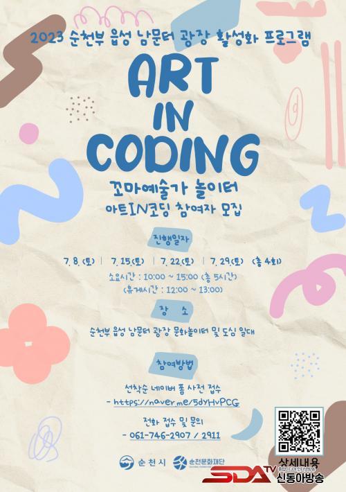 ³²¹®ÅÍ ±¤Àå ¾î¸°ÀÌ ¹®È¿¹¼úÇÁ·Î±×·¥ ¡®¾ÆÆ®INÄÚµù¡¯Àº 7¿ù 8ÀϺÎÅÍ 7¿ù 27ÀϱîÁö ¸ÅÁÖ Åä¿äÀÏ ¿ÀÀü 10½ÃºÎÅÍ ¿ÀÈÄ 2½Ã¿¡ ¼øÃµºÎ À¾¼º ³²¹®ÅÍ ±¤Àå ¹®È³îÀÌÅÍ¿¡¼ ÁøÇàµÇ¸ç, Âü°¡ºñ´Â ¹«·áÀÌ´Ù. ³×À̹ö Æû°ú Àüȸ¦ ÅëÇØ Á¢¼öÇÏ¸ç ¼±Âø¼øÀ¸·Î 8¸íÀ» ¸ðÁýÇÑ´Ù.