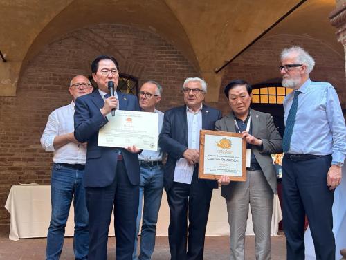 [½Åµ¿¾Æ¹æ¼Û=ÀÌÁöÇö±âÀÚ] Àü³² ¿Ïµµ±ºÀÌ Áö³­ 6¿ù 24ÀÏ ÀÌÅ»¸®¾Æ ÆÄ¸£¸¶¿¡¼­ ¿­¸° ¡®2023 ±¹Á¦ ½½·Î½ÃƼ¿¬¸Í ÃÑȸ¡¯ÀÇ ±¹Á¦ ½½·Î½ÃƼ ¿ì¼ö »ç·Ê ÄÜÅ×½ºÆ®¿¡¼­ ÃÖ°í»óÀÎ ¡®¿À·»Áö ´ÞÆØÀÌ »ó(Chiocciola Orange 2023)¡¯À» ¼ö»óÇÏ´Â Äè°Å¸¦ ÀÌ·ð´Ù.