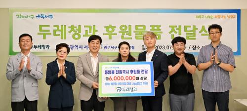 [½Åµ¿¾Æ¹æ¼Û=ÃÖ¿ëÀϱâÀÚ] ±èÀ̰­ ¼­±¸Ã»ÀåÀº Áö³­ 3ÀÏ ¿ÀÈÄ µÎ·¹Ã»°ú(´ëÇ¥ÀÌ»ç ÇѼö¿µ)·ÎºÎÅÍ Ç³¾Ï õ¿ø±¹½Ã ³ª´®³ÃÀå°í¸¦ ÅëÇØ °ü³» ¾î·Á¿î ÀÌ¿ôµé¿¡°Ô Àü´ÞÇÒ 600¸¸¿ø »ó´çÀÇ Á¦Ã¶°úÀÏÀ» ¹Þ°í °¨»çÀÇ ¸¶À½À» ÀüÇß´Ù.