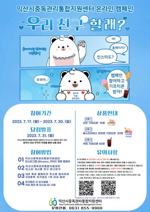 ÀÍ»ê½Ã¹Î ´©±¸³ª Âü¿© °¡´ÉÇϸç Ä·ÆäÀÎ ´ç÷ÀÚ´Â 7¿ù 31ÀÏ ÀÍ»ê½ÃÁßµ¶°ü¸®ÅëÇÕÁö¿ø¼¾ÅÍ È¨ÆäÀÌÁö ¹× ÀνºÅ¸±×·¥À¸·Î °ø°³ÇÒ ¿¹Á¤ÀÌ´Ù. Ãß÷À» ÅëÇØ ¼±Á¤µÈ ´ç÷ÀÚ¿¡°Ô´Â °³º°¹®ÀÚ·Î ¼ÒÁ¤ÀÇ »óǰÀ» Áö±ÞÇÑ´Ù.