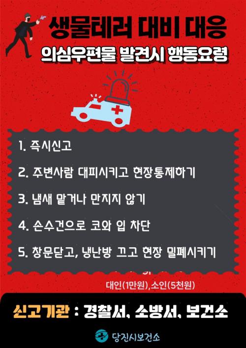 ½Ã º¸°Ç¼Ò °ü°èÀÚ´Â ¡°Å×·¯ ÀÇ½É ¹Ì»ó ¿ìÆí¹° ¹ß°ß ½Ã °æÂû¼, ¼Ò¹æ¼, º¸°Ç¼Ò µî À¯°ü±â°ü¿¡ ½Å°íÇÏ¿© ½Å¼ÓÇÑ ´ëÀÀÁ¶Ä¡·Î Áö¿ª»çȸ ÇÇÇØ¸¦ ÃÖ¼ÒÈÇÒ ¼ö ÀÖµµ·Ï °ü½ÉÀ» °¡Áö°í ÁÖÀÇÇØ´Þ¶ó¡±°í ¸»Çß´Ù.