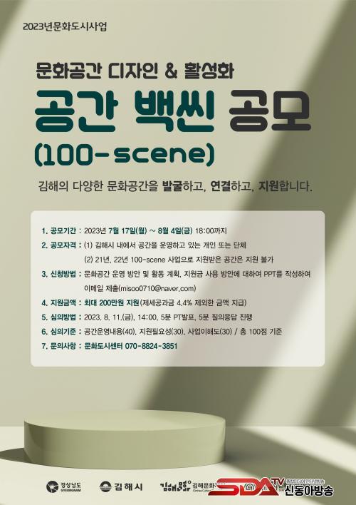 (Àç)±èÇØ¹®ÈÀç´Ü ¹®Èµµ½Ã¼¾Åʹ¡®°ø°£ ¹é¾À(100-scene) °ø¸ð¡¯¸¦ 7¿ù 17ÀÏ(¿ù)ºÎÅÍ 8¿ù 4ÀÏ(±Ý)±îÁö ÁøÇàÇÑ´Ù. ±èÇØÀÇ ¹Î°£ ¹× °ø°ø °ø°£À» ¼ÒÀ¯Çϰųª ¿î¿µ ÁßÀÎ °³ÀÎ ¹× ´ÜüÀ̸ç, °ú°Å¿¡ °°Àº °ø¸ð·Î Áö¿ø¹ÞÀº ÀÌ·ÂÀÌ ¾ø´Ù¸é ´©±¸³ª Áö¿ø ÇÒ ¼ö ÀÖ´Ù.