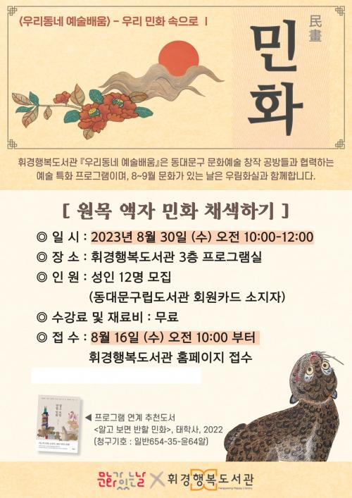 ÈÖ°æÇູµµ¼°üÀº ¿¹¼ú Ư¼ºÈ µµ¼°üÀ¸·Î¼ ¸Å¿ù ¡®¹®È°¡ ÀÖ´Â ³¯¡¯ ¿¡´Â <¿ì¸® µ¿³× ¿¹¼ú ¹è¿ò> ÇÁ·Î±×·¥À» ¿î¿µÇÑ´Ù. º» ÇÁ·Î±×·¥Àº µ¿´ë¹®±¸ Áö¿ª°ø¹æ°ú Çù·ÂÇÏ¿© ±¸¹ÎµéÀÇ ¹®È üÇè ±âȸÀÇ ÆøÀ» ³ÐÈ÷°íÀÚ ¸¶·ÃµÇ¾ú´Ù.