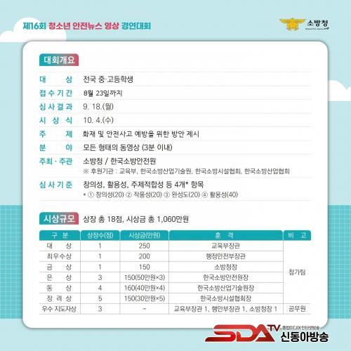 Âü°¡´ë»óÀº Àü±¹ÀÇ Áß¡¤°íµîÇлýÀ̸ç, ÈÀç ¹× ¾ÈÀü»ç°í ¿¹¹æÀ» À§ÇÑ ¹æ¾ÈÁ¦½ÃÀÇ ÁÖÁ¦·Î, ´º½º, ½Ã»ç ÇÁ·Î±×·¥, Åä·Ð°ú ´ë´ã µî 3ºÐ À̳» º¸µµÇü½ÄÀÇ ¿µ»ó¹°À» Á¦ÀÛÇÏ¸é µÈ´Ù.