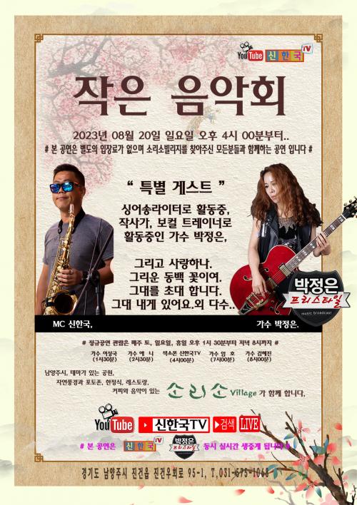 ÀÛÀº À½¾Çȸ´Â ¿¹¼úÀÇ Áñ°Å¿òÀ» ´©¸®¸ç, À½¾ÇÀ» ÅëÇØ ´Ù¾çÇÑ À̾߱â¿Í °¨Á¤À» °øÀ¯ÇÒ ¼ö ÀÖ´Â ¼ÒÁßÇÑ ±âȸÀ̸ç, °¡¼ö ¹ÚÁ¤Àº ¾¾¿Í ÇÔ²²ÇÏ´Â ÀÌ ³¯, À½¾ÇÀ» ÅëÇØ ´õ dz¼ºÇÑ ¸¶À½À» ´À²¸º¸¼¼¿ä. ÀÚ¼¼ÇÑ ÀÏÁ¤ ¹× Àå¼Ò´Â À¯Æ©ºê ¡®½ÅÇѱ¹TV¡¯ ä³Î Ä¿¹Â´ÏƼ¿¡¼ È®ÀÎÇÏ½Ç ¼ö ÀÖÀ¸¸ç, ¡°¹ÚÁ¤ÀºÀÇ ÇÁ¸®½ºÅ¸ÀÏ¡±, ä³Î°ú ¡°½ÅÇѱ¹TV¡±, ä³Î·Î µ¿½Ã¿¡ ½Ã½Ç °£ ¶óÀÌºê ¹æ¼ÛÀ¸·Î ¸¸³ª º¼ ¼ö ÀÖ´Ù°í ÀüÇß´Ù.