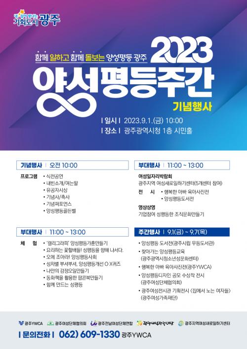 ±â³äÇà»ç´Â ±¤ÁÖYWCA¡¤±¤ÁÖ¿©¼º´ÜüÇùÀÇȸ¡¤±¤ÁÖÀü³²¿©¼º´Üü¿¬ÇÕÀÌ °øµ¿ Âü¿©ÇØ ¡®ÇÔ²² ÀÏÇϰí ÇÔ²² µ¹º¸´Â ¾ç¼ºÆòµî ±¤ÁÖ¡¯¶ó´Â ÁÖÁ¦·Î ¾ç¼ºÆòµî ¹®È­ È®»ê ¹× Áö¿ª¿©¼º°èÀÇ ´ÜÇÕ°ú »ó»ýÀÇ ±æÀ» ¸ð»öÇÑ´Ù.