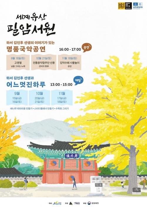 ±º¿¡ µû¸£¸é, ¿ÃÇØ ±¹¾Ç°ø¿¬Àº ¡®¼¼°èÀ¯»ê Çʾϼ­¿ø, È£³²ÀÇ ¼±ºñ Çϼ­ ±èÀÎÈÄ ¼±»ýÀ» ¸¸³ª´Ù¡¯¸¦ ÁÖÁ¦·Î °ü°´°ú ¸¸³­´Ù. 9¿ù¿¡¼­ 11¿ù±îÁö ¸Å¿ù ¼Â° ÁÖ Åä¿äÀÏ ¼­¿ø ¾Õ Àܵ𸶴翡¼­ ¿­¸± ¿¹Á¤ÀÌ´Ù.