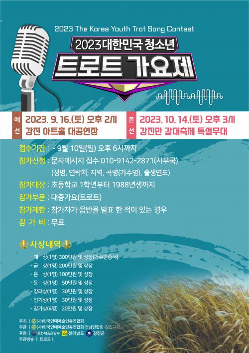 À̹ø 2023 ´ëÇѹα¹ û¼Ò³â Æ®·ÎÆ® °¡¿äÁ¦´Â ´ë»ó 1¸í¿¡°Ô »ó±Ý 300¸¸¿ø°ú °¡¼ö ÀÎÁõ¼¸¦ ÁÖ´Â »óÀåÀÌ ¼ö¿©µÇ¸ç ±× À̿ܿ¡µµ 9¸íÀÇ ½Ã»óÀÚ¿¡°Ô »óÀå ¹× »ó±ÝÀÌ ¼ö¿©µÉ ¿¹Á¤ÀÌ´Ù.