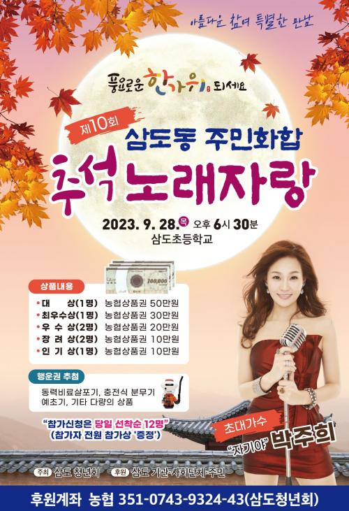 ÈïÀ» ´Þ±¸´Â »ïµµ¿ìµµ³ó¾ÇÀÇ Ç³¹°³îÀÌ¿Í ³Å¸ °ø¿¬À» ½ÃÀÛÀ¸·Î ÁֹΠ³ë·¡ÀÚ¶û, ¡®ÀÚ±â¾ß¡¯, ¡®¿Àºü¾ß¡¯ µîÀ» ºÎ¸¥ ÃÊ´ë °¡¼ö ¹ÚÁÖÈñÀÇ ÃàÇϰø¿¬, Çà¿î±Ç Ãß÷ µîÀÌ ÁøÇàµÈ´Ù. ³ë·¡ÀÚ¶û Âü°¡ÀÚ ½ÅûÀº ´çÀÏ ÇöÀå¿¡¼ ¼±Âø¼øÀ¸·Î Á¢¼öÇÑ´Ù.